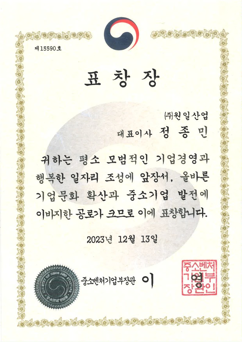 선정 부문은 "행복한 일자리"로 국내 유수의 많은 기업 중 엄격한 심사를 거쳐 당사가 선정되었음을 알려드립니다.